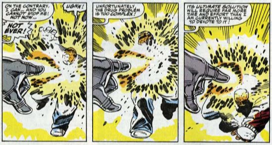 Ben is then hit from an energy bolt. He turns and finds Dr. Doom. This is Doom’s secret lab, but Doom insists it’s not a drug lab. On the contrary. Doom says that he’s not going to rule the world if the world has a drug problem, so he started this lab to eradicate the city’s drugs.