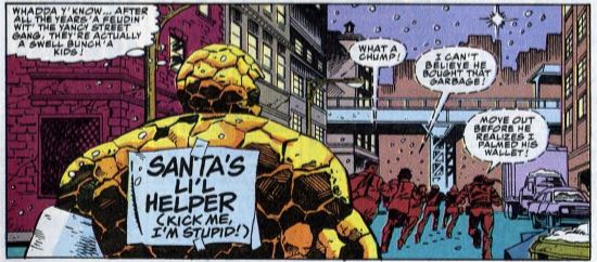 It’s Christmas Eve, and Reed is putting a high-tech cast on Ben’s arm, after it was injured during the fight with the Dreadface symbiote last issue. After some signing-the-cast humor, Ben gets a message from Roberta the robot secretary in the Four Freedoms Plaza lobby. Ben has a visitor — Slugger Sokolowski, a childhood friend of Ben’s from his old neighborhood.