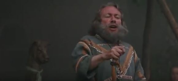 As Willow walks up to the stage, of course Burglekutt heckles him, saying “Is this a joke?” and laughing. Willow gives him an angry stare and, it’s worth noting, the High Aldwin also gives Burglekutt an angry stare. Willow and two other unidentified males stand before the High Aldwin, who stands and says, “Magic is the blood stream of the universe. Forget all you know, or think you know. All that you require is your intuition. Now, the power to control the world is in which finger?” He holds up his hand.