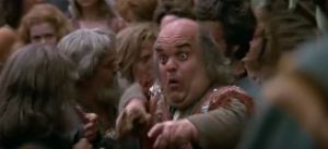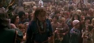 The band plays a fanfare, and out comes the High Alwin, on a chair being carried by four male Nelwyn. Just who are these four guys carrying him around? His servants? His students? Something uglier? We can only wonder. An unidentified man announces that the High Aldwin will now make his choice for apprentice. The tie-in books state that as part of this festival, each year the High Aldwin tells the story of the first Nelwyn settlers. Either that’s already happened, or he’s saving it for later.