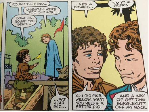 We see Meegosh with Willow, telling him “Good luck.” We’ve seen Meegosh in the crowd during the festival, but this is the first time we’ve established he and Willow are friends. The graphic novel adaptation does a better job of introducing Meegosh, as he and Willow recite a customary rhyme to each other. Meegosh: “Round the bend.” Willow: “Fat rear end.” Meegosh: “He’s a donkey.” Willow: “I’m your friend.”