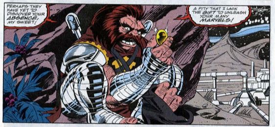 We then cut to, according to the caption, “A universe far beyond the fragile fabric of conventional reality, in a dimensional plane which exists at the juncture of all physical matter.” In this space, we meet Wildblood, a mercenary thief, who has just snuck out of a futuristic city having stolen some valuable gems. He sees Reed’s hand stretching through into his dimension, and he believes Reed is a member of the Gem Guild, who is after Wildblood. Reed’s hand disappears before Wildblood can properly attack.