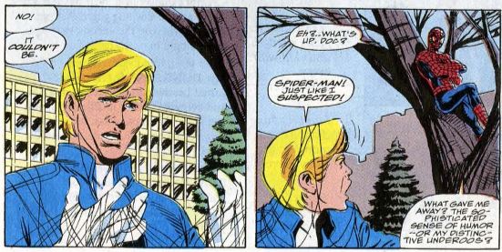 Back on Earth, the tabloids have reported that Johnny and Alicia have broken up (but not with the knowledge the Alicia had been replaced by a Skrull the whole time). Spider-Man is seen reading this (he reads the tabloids?) and thinks that he should drop by later to visit Johnny. He doesn’t need to, though, because his next stop is Empire State University, where Johnny is considering returning to college. He then signs autographs outside, only for his Fantasticar to be attacked by a bat-shaped creature. Turns out it was made of Spider-Man’s webs.