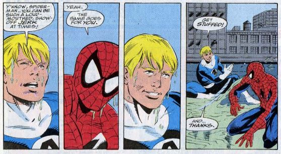 Flame on: What, exactly, was Spider-Man doing by starting a fight with Johnny? Was it all a ruse to cheer Johnny up, or was he really that upset about what he read in the tabloid? The comic doesn’t actually say.