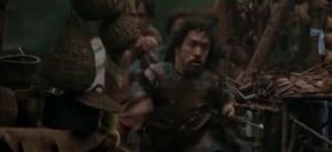 The dog’s presence in the festival causes a lot of commotion, with everyone running around like crazy. Burglekutt and the High Adlwin both get reaction shots. Willow asks Meegosh where little Mims ran off to, and Meegosh says he doesn’t know. Ranon takes the other kid, Ranon, away for protection while Willow looks for Mims. The dog continues to run through the festival, and there’s a great Evil Dead-style shot of the dog’s POV, chasing everyone at high speed. Then there’s a shot of Mims, standing on a wooden platform of some sort, crying.