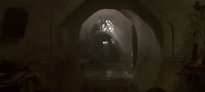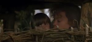 The next shot is Willow bursting through the front door of his house, suggesting that his land isn’t that far from the festival’s location. He calls for Kaiya, and for a few seconds there is no answer, suggesting the death dogs got her. But then she walks into frame holding the baby. Willow embraces his wife and tells her they can’t keep the baby, and must take her to the village council. Kaiya responds with a nod, understanding that this is important, and they embrace again.