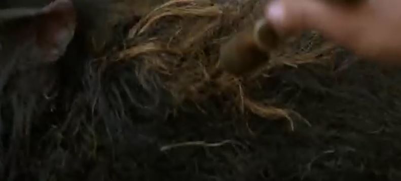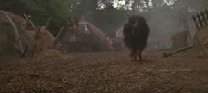 We’re still at the Nelwyn festival, where the peppy music starts playing, everyone is again doing that dance holding up green leafy branches. The sound of a wild animal is heard in the distance and everyone starts to panic. It almost sound like two animals, with a growl and howl overlaid on each other. One of the death dogs comes running right through the center of the festival.