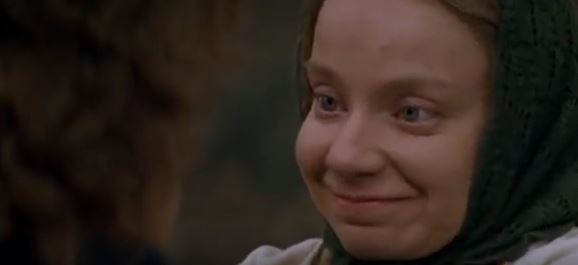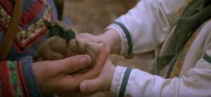 Kaiya says “I miss you already.” He says he’ll be fine and he’ll be back before she knows it. Her next line is hard to understand. According to the Blu-ray’s subtitles, she’s saying “Remember to keep her warm.” She then hands Willow a braid of her hair, he compares it to a tuft of hair coming from under the headscarf thing she’s wearing, and realizes she’d just cut it off. “This will bring you luck,” she says. They hug, and kiss. The braid isn’t going to have as many appearances throughout the movie as the acorns, but when we do see it again, it serves as a reminder of how far Willow has traveled.