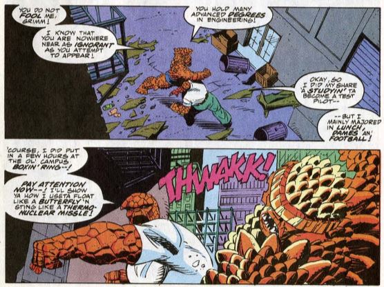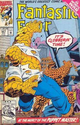 Puppet Master says he’s only following Ben because he’s concerned about Alicia, and he accuses Ben of betraying Alicia. Ben says it’s complicated, what with the whole replaced-by-a-Skrull thing. Before they can converse further, a portal opens behind Ben, and out comes Ben’s doppelganger. It appears in Ben’s stronger-than-usual spikey form, and the two Things fight, damaging some nearby buildings. They make their way to a construction site, trashing it as the fight, and then onto a crowded subway platform. Puppet Master saves the day by carving a puppet of the doppelganger right there on the spot, and then throwing it onto the subway’s third rail, electrocuting both the puppet and the doppelganger.