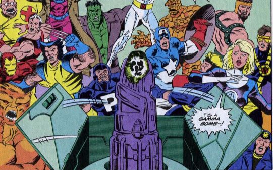 Some of the heroes think that Wolvie and Daredevil are the doppelgangers, so we get the requisite scene of all the superheroes fighting each other. Evil Reed than reveals a gamma bomb hidden inside the room. The final panel is an explosion bursting out of the top floors of the building.