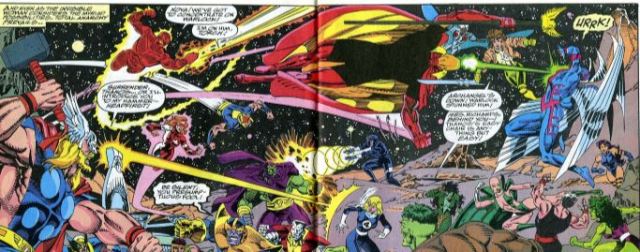 Sue takes leadership of the superhero task force over Captain America, saying the heroes must attack Magus as soon as possible, before Magus gets adjusted to his new power. When the Hulk makes fun of her, Sue throws him around the room with her force fields. Ben and Johnny note that Sue is acting different than usual. The heroes open another portal (I’m assuming Dr. Druid is the one who does this, since he’s standing right next to it) to follow Magus. They jump through it, only to face an army of their own doppelgangers. Everybody fights. While the battle rages, we see that Magus has succeeded in wresting the Infinity Gauntlet from Warlock, claiming his victory over Warlock… and infinity itself.