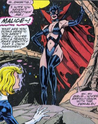 In Galactus’ ship, Galactus runs a cerebral scan of all the heroes to get everyone up to speed. This has unforeseen complications for Sue, though, as she gets lost in a surreal mindscape of her own subconscious. There, she is confronted by Malice. The comic rightly points out that Malice was merely a temporary name and costume Sue adopted when she was being influenced by the Hate Monger (in issues #280-281). This version of Malice disagrees, saying that she’s always existed as living psychic entity repressed deep within Sue’s subconscious.