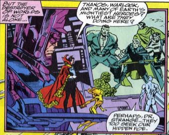 The fight is interrupted when Galactus’ ship appears overhead, and beams everyone aboard. Inside, Dr. Strange, the Silver Surfer, Galactus, and former FF member Frankie Raye are on board, just having finished their own Eternity Quest crossover. Meanwhile, Magus has created a doppelganger of Thanos, and the two of them are secretly watching all this, with Magus bragging about how this is all going according to his plan. Magus presses a button in his ship, saying it’s time to take control of the Earth.