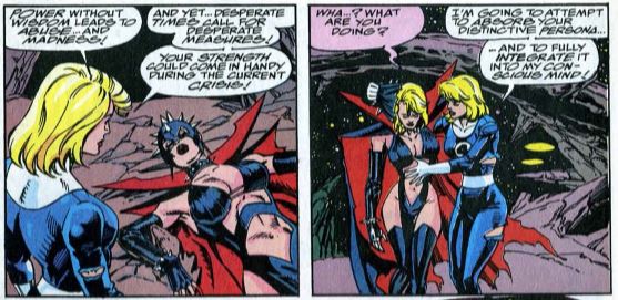 Sue and Malice fight, with Malice arguing that Sue needs Malice’s aggression and ferocity to deal with the conflict that lies ahead. Sue defeats Malice, and then absorbs Malice’s persona into her own somehow, hoping to combine Malice’s with Sue’s wisdom and compassion. Back in Galactus’ ship, Sue awakes and tells Johnny she’s never felt better.