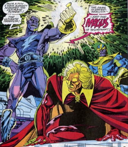 Sue takes leadership of the superhero task force over Captain America, saying the heroes must attack Magus as soon as possible, before Magus gets adjusted to his new power. When the Hulk makes fun of her, Sue throws him around the room with her force fields. Ben and Johnny note that Sue is acting different than usual. The heroes open another portal (I’m assuming Dr. Druid is the one who does this, since he’s standing right next to it) to follow Magus. They jump through it, only to face an army of their own doppelgangers. Everybody fights. While the battle rages, we see that Magus has succeeded in wresting the Infinity Gauntlet from Warlock, claiming his victory over Warlock… and infinity itself.