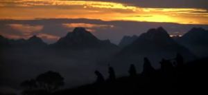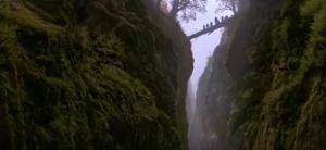 Next we get the second half of the Nelwyn’s travel montage, which started a few scenes ago. First is a very Lord of the Rings-ish shot of the Nelwyn marching single file in silhouette along a mountaintop with taller mountains in the background. Then there’s a shot of the group sitting around the campfire sharing a meal, and this is where the score switches from suspenseful to uplifting, telling the audience they’ve successfully escaped. After that, the group is crossing a log across huge chasm of two cliffs, and then them walking among some large trees.