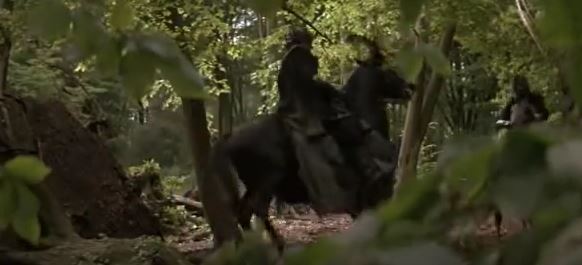 We begin with a shot of Burglekutt walking out from behind a tree, wiping his hands on his shirt. Was he just using this tree as his bathroom? Let’s hope not, because he walks over to two of the others and has a bite to eat. The camera mercifully pans over to Willow, tending to the baby. He hears a dog howl, and then sees two NockMaar soldiers in the distance, riding toward them. Vohnkar of course is the first to leap into action, ordering the others to “Move!” The rest of the Nelwyn quickly gather their things as the riders get closer.