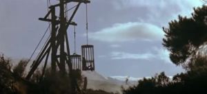 The montage ends with an odd shot of the Nelwyn emerging from an opening in a group of chalky white trees. Is this some sort of hidden entrance to pathways eventually leading to the Nelwyn village, or just the group’s way of staying out of site? Vohnkar leads the way, and announces “There it is! The crossroads!” The music stirs, but then cuts out as we see these “crossroads” are a rickety wooden structure with two large cages hanging from it. That’s where we’ll pick things up next time.