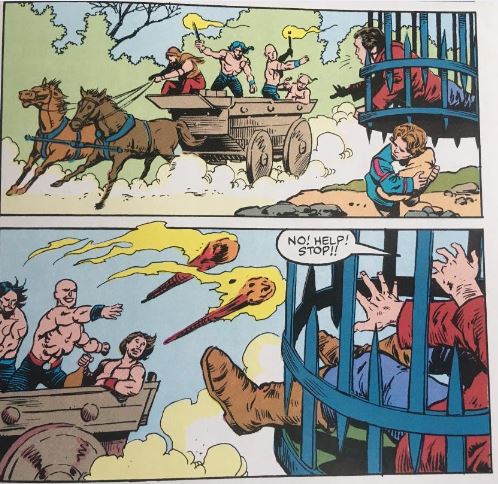 In the Willow graphic novel, there’s an odd addition to this scene, in which a horse drawn cart goes by with some men on it. The men throw some lit torches at Madmartigan, burning his feet. They then ride off again. Madmartigan says to Willow, “Why not give them the baby? They eat babies!” I suspect these strangers are meant to be the caveman-like Poha referenced in the other tie-in books, but there’s no way to know for sure.