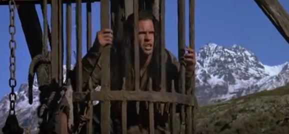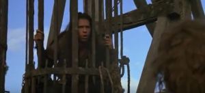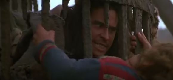 The howling is heard again, and Willow backs up against one of the cages. It’s a big jump scare when a hand reaches down from inside the cage and grabs him. They won’t reveal this character’s name for a little while, but come on, we all know it’s Madmartigan. “Give me some water, peck,” he says, “or you die.” Get used to this word “peck” being used in an offensive, insulting manner throughout the film. He demands water a second time, and drops Willow. Willow falls back with the other Nelwyn, and nobody brings the water. This just makes Madmartigan angrier, saying “Bring me some water, you measly little pecks.”