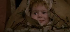 Madmartigan’s attitude has changed, as he now smiles at the group. Vohnkar says they have to give the baby to somebody, and Madmartigan says, “I’m somebody.” He offers to take care of the baby if they let him out of there. He makes kissing noises at the baby, and there’s a terrific reaction shot of the baby with an “I’m not so sure about this” look on her face.