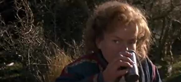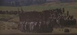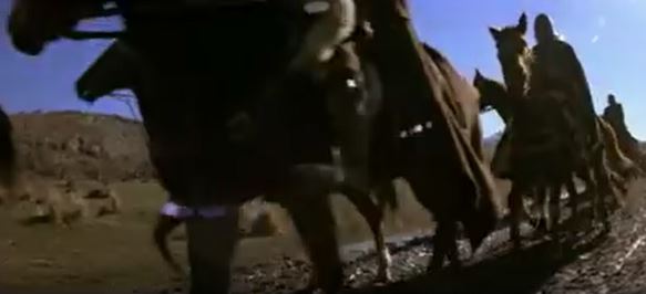 We then see a whole fleet of soldiers on horseback marching in their direction. (No CGI here, that really is a couple hundred extras on horses, all in full battle armor.) Madmartigan does the math, saying it’s two to three hundred horses, five or six wagons, “and about a thousand fools.” He keeps reaching for the water as he says this, for a little more slapstick. Distracted, Willow tries to hand Madmartigan the water, but drops it. Only a few drops of water hit Madmartigan’s fingers. Then there’s an odd beat with him desperately licking the water off his hand, to show just how dire his circumstance is.