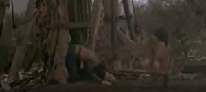 There’s a shot of the road with only dust on it, signifying that the soldiers have moved on. Willow steps into frame, holding the baby. He and Madmartigan eye each other silently, and then Willow says he misses his family. Meegosh says they’re running out of food, and Madmartigan says there’s no one around who will take care of the baby. “You know why?” he says, “Nobody cares.” He says they want to go home and he wants out of the cage. He offers to take care of the baby as if she were his own. Meegosh says he believes Madmartigan. Or, perhaps Meegosh is just saying that because he wants to leave. Willow argues that Madmartigan knows nothing about babies. Madmartigan half-explains and half-brags that he knows a lot of women who do.