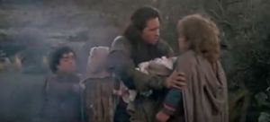 There’s a comedy bit where Madmartigan spins the baby around, followed by a reaction shot of her looking scared. He says “she likes me,” and the baby’s next reaction shot is a smile. Willow gives Madmartigan the baby’s changing rags, which look like just one rag. (I doubt that will last long) and a “milk bladder.” Madmartigan asks if there is milk in it, and Willow says it’s for her. Offended, Madmartigan says “I wouldn’t steal from a baby.” Like the greatest swordsman line earlier, this line is said with just enough seriousness that we believe it.