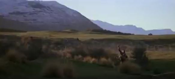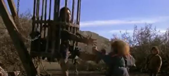 It’s hard to tell what happens next. It appears that a sword or knife strikes a lock on the on the cage, resulting in the entire bottom of the cage opening like a trap door. Madmartigan falls through it onto the ground. When the camera pulls back we see Meegosh was the one that struck the lock. First, I think we can assume this is lock Madmartigan wanted to pick in the previous scene. But then, who designed these cages so the bottom is the opening? How did Madmartigan’s captors get him in there to begin with? Did one person hold him up through the bars while another lifted the floor in place? Perhaps this opening is merely to empty out bodies after they’ve died, and there’s a separate traditional cage door among the bars that opens.