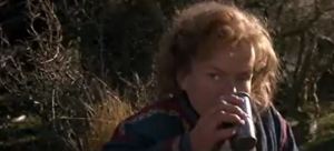 Madmartigan is immediately overjoyed to be out of the cage. He lifts Meegosh up and says “I feel better! You’ve done the right thing!” He jumps and spins around in the air with a “Whoo!” It’s interesting that although he’s dying of thirst, he’s not going straight for the water. Willow is all business, saying “You’ve got to promise to feed her.” Madmartigan appears enthusiastic about keeping his end of the deal, saying “Come to daddy.” Willow adds, “and keep her clean.” Madmartigan says “Absolutely.” Despite Madmartigan’s newfound positive attitude, Willow is deadly serious about reminding him of what’s important.