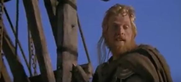 One of the soldiers stops, eyeing Madmartigan, who just glares back at him. Willow explains to the man that they found the baby in his village. “Will you please take care of her?” The soldier takes off his helmet to reveal a gruff figure with red hair and a red beard. In full tough-guy mode, he says, “We’re going into battle, little ones. Find a woman to take care of her.” Madmartigan shoots back with an insult, “I thought you were a woman, Airk.” (“Airk” is pronounced like “Eric.”)