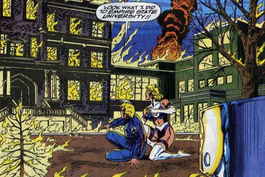 Johnny, however, is overwhelmed by all three villains, and decides the only way to defeat them is to use his mega-powerful nova flame. Sue arrives on the scene to find the villains gone, and Johnny weakened from the fight, admitting that he panicked and lost control. Then we turn the page and see that Johnny’s nova blast has destroyed most (all?) of Empire State University.