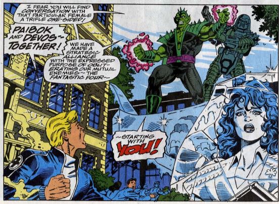 Back with Johnny, he manages to free Bridget from the ice while the college is evacuated. Then a third enemy joins the fight, It’s Lyja, still alive. Johnny doesn’t believe it’s her, especially seeing her new energy-blasting powers. She explains that Paibok gave her these powers, and she introduces her new moniker, Lyja the Laserfist! The three of them are too much for Johnny to fight at once, so he fires the ol’ FF emergency flare. Sue sees it and runs off to join the fight.