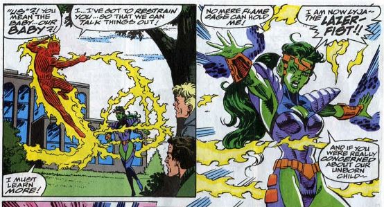 The Alicia problem: Lyja originally sacrificed herself to save Johnny, but now she wants to kill him with furious anger. Lyja makes a few references to her and Johnny’s unborn child, even though that originally a lie. Johnny’s demands for further details go unanswered.