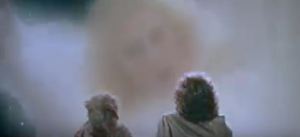 Then there’s an odd bit where Cherlindrea just up and vanishes, leaving Willow, Meegosh, and the Brownies alone. Willow calls, “Hello?” but there’s no answer. There’s a shot of the Brownies looking around worriedly, as if someone or something is about to attack. There’s a gust of wind, and Cherlindrea reappears, now seeming gigantic, moving forward until her face and glowing robes fill the entire screen. She goes full King Lear and proclaims, “Elora Danan must survive. She must fulfil her destiny and bring about the downfall of Queen Bavmorda, whose powers are growing like an evil plague. Unless she is stopped, Bavmorda will control the lives of your village, your children, everyone.”