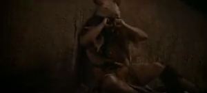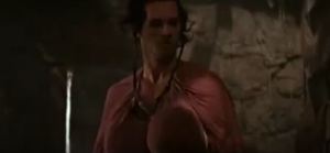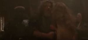 There’s more rowdy behavior from the tavern patrons, where two men on two other men’s shoulders hit each other with flails. One of the men falls near Willow, conveniently knocking him, the baby, and Franjean through a loose board into the next room. There’s more activity in this room, as a panicking woman is running around saying, “If my husband catches you, he’ll kill us both!” The camera pans over to reveal Madmartigan… in a pink dress.