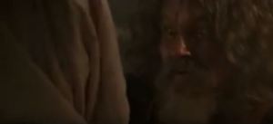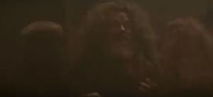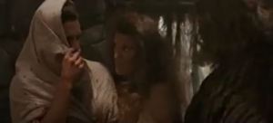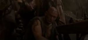 Madmartigan backs up to the door and is about to make an escape when it opens, and several black-clad soldiers enter. We see the soldiers rounding up everyone in the tavern, including Madmartigan, Willow, Llug, and the wench. The camera pushes in close on Madmartigan’s face, as he realizes what’s going on and how the serious the situation is. Sorsha is there, checking another baby for the mark on its arm. “That’s not the one,” she says. Willow then reacts, realizing that this one of the head bad guys.