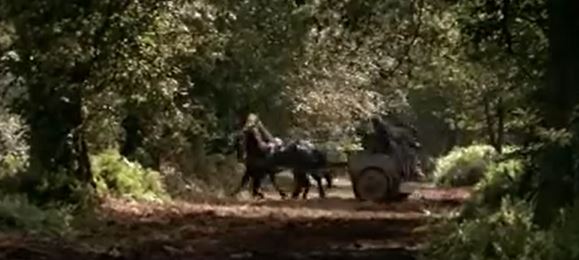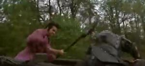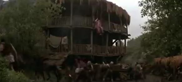 Still without a sword, Madmartigan picks up a large block of wood as a weapon. If this wagon falls apart this easily, I’m sure spare wood was on board in case on-the-road repairs were needed. The charioteers keep the variety-of-weapons fun going by pulling out a mace. Willow regains consciousness as Madmartigan and the charioteers swing their weapons at each other. A tree is in the path, and the two vehicles go around each side. You can hear Madmartigan say “Willow, stay down!” So Madmartigan isn’t just trying to escape. He really does care.