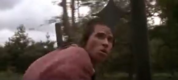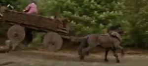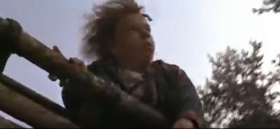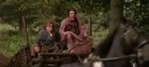The Brownies run around, avoiding everyone’s feet, while Willow climbs onto the front of the wagon, calling for Madmartigan to stop. The reins, however, are loose, barely dangling off of the front of the wagon. Somehow, the sword is gone, as the NockMaar is now strangling Madmartigan. This NockMaar is not wearing a metal helmet, but a big furry cap. (I’m guessing this is to protect the stuntman’s safety gear.) Madmartigan punches him, and then gets on top of him. We don’t see what he does, because the movie cuts to Rool, acting seasick (Carsick? Wagonsick?). It’s hard to hear, but Rool says “No more beer,” referencing the previous scene. Willow reaches for the reins, but they slip and between the two horses, who are still mindlessly galloping forward at full speed.