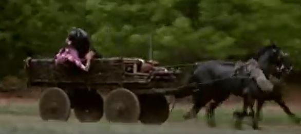 There’s a big log in the path. The horses instinctively leap over it to keep running, and the wagon bumps over it and into the air, getting some impressive hang time before crashing back to the ground. The impact knocks Willow forward, onto the wooden rigging connecting the horses to the wagon (I know there’s a word for this, but darned if I could find it.) Rool is thrown a small hole in the side of the wagon and is hanging on for dear life. He calls to Franjean for help.