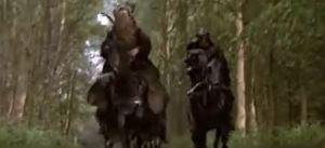 Madmartigan grabs ahold of Willow’s cloak and pulls him and the baby to the side. The Brownies follow. Rool, still dizzy from the wagon chase, says, “Don’t worry about me, I’m fine.” Then he does a slapstick pratfall. Madmartigan says “Get down!” And he, Willow, and Franjean hide to the side of the road as those remaining NockMaar ride up. (See? I was right about them following the wagon.) There’s more slapstick as the horse’s hooves narrowly miss Rool as he bumbles about. Franjean says “Rool you fool, get out of the road.” This gives the special effects a hand in cluing in the audience as to who is where. The NockMaar soldier ride past, not seeing our heroes. There are six of them now. So that’s three left behind from the tavern, and three new ones.