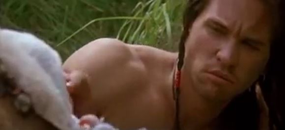 Madmartigan says Willow had better “clear out” before more troops come back. Willow speaks to the baby, saying “We don’t need him.” The baby starts crying upon hearing this. A running gag throughout the movie is Elora Danon somehow (magically?) aware of what’s going on around her. The now-shirtless Madmartigan walks into an open grassy area, apparently no longer concerned with hiding. Willow pursues him, shouting “Madmartigan, wait!” Madmartigan off-handedly tells Willow to go home. “It’s a dangerous world,” he says. Willow answers by saying “That’s why we need your help.” Recalling the conversation when the met, Madmartigan says, “What do you need my help for? You’re a sorcerer.” He adds a flourish with his hand upon saying “sorcerer,” mocking Willow. Willow calls Madmartigan “a great warrior and a swordsman,” then he adds, “and you’re ten times bigger than I am, stupid!” This angers Madmartigan, as he turns and points at Willow, saying, “Do you want to make my life harder than it already is?”