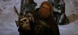 General Kael enters with two NockMaar soldiers. Bavmorda asks if he’s found the child. Kael, not wearing his skull helmet but still holding it to his side, says, “The search goes on, my queen.” Bavmorda says, “Why, with my powers and the strength of my army, can you not find one little child” The “with my powers” part of that sentence is interesting. Has Bavmorda given his warrior strength a boost with her magic? “We look even now,” Kael says. “It won’t be long.”