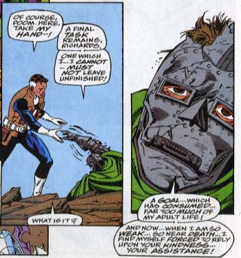 Reed approaches Doom, who is now battered and beaten, to offer help. Doom says he cannot die knowing that Reed still lives. As Reed offers a helping hand, Doom takes it, only for them both to explode in a burst of light, leaving behind nothing but ashes.