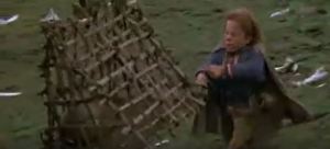 Raziel says to Willow, “Hurry, practice the chant I taught you.” When did she teach him? On the island, in the rowboat, or just now in their captivity? We don’t know. Willow chants, “Tanna, tuatha,” and then he can’t remember the third word. This is the first time in the movie we’ve heard “Tanna,” so perhaps that’s one Raziel taught him. Raziel says the third word is “Locktwaar,” adding, “That’s the word that pleads for change.” Not many fantasy adventure stories give specific meaning to magic words, so good on Willow for this glimpse into whatever magic system is at work.