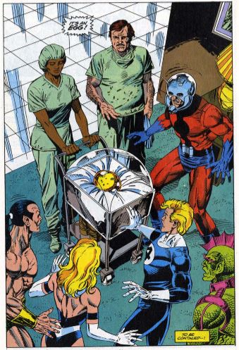 Trivia time: The tiny amount of people online still talking about Starblast seem to agree that the Namor half of this Namor/Quasar crossover had nothing to do with anything, and seeing as how it unceremoniously wraps up in this FF tie-in issue, I’m inclined to agree. The real action took place in space, where Quasar led a ton of D-list Marvel to battle a cosmic villain named Skeletron. Quasar’s team included the Shi’ar Imperial Guard, the Soviet Super-Soldiers, and, in a surprise twist, all of Marvel’s ill-fated New Universe characters. The series ended with everybody from the New Universe being brought into the Marvel Universe proper.