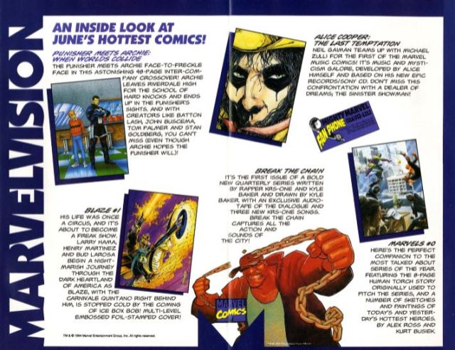 Commercial break: So here is an ad for the “Marvelvision” line, made up of Neil Gaiman’s Alice Cooper comic, Ghost Rider spinoff Blaze, the not-an-urban-legend Punisher Meets Archie, the Alex Ross classic Marvels, and Break the Chain, which came packaged with a rap cassette tape. I own all but one of these (I’ll let you guess which one) and none of the actual comics come with any “Marvelvision” branding.