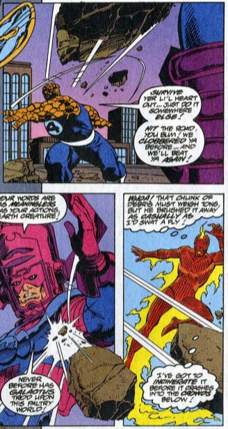 Flame on: Johnny spends the issue wanting to get back to Lyja, and he says that if the team survives the fight with Galactus he plan on resigning from the FF. So they’re still foreshadowing an upcoming team break-up storyline.