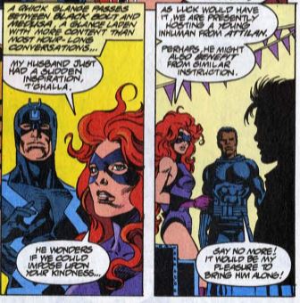 Then we cut to the Black Panther, who is meeting with the Inhuman royal family. The Inhumans are currently on Earth, traveling incognito as circus performers. Black Panther introduces Vibraxas, a Wakandan teen who has developed super-powers. Black Panther wants the Inhumans’ help in locating the Fantastic Four, so the FF can help understand Vibraxas’ powers and maybe teach the rebellious kid a thing or two about how to behave. Medusa says they can’t help him, but the Inhumans have a similar problem, a troubled super-powered teen of their own.