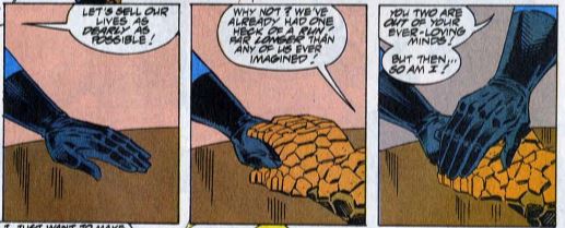 Clobberin’ time: It’s hard to tell, but it appears that when Ben is turned back into a human, he still has the scars on his face he got from Wolverine back in issue #374.
